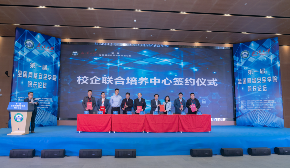 会议期间,国家网络安全人才与创新基地、武汉大学、华中科技大学与安恒信息等六家企业签署协议,共同发起成立校企联合培养中心,为校企合作育人提供重要平台。