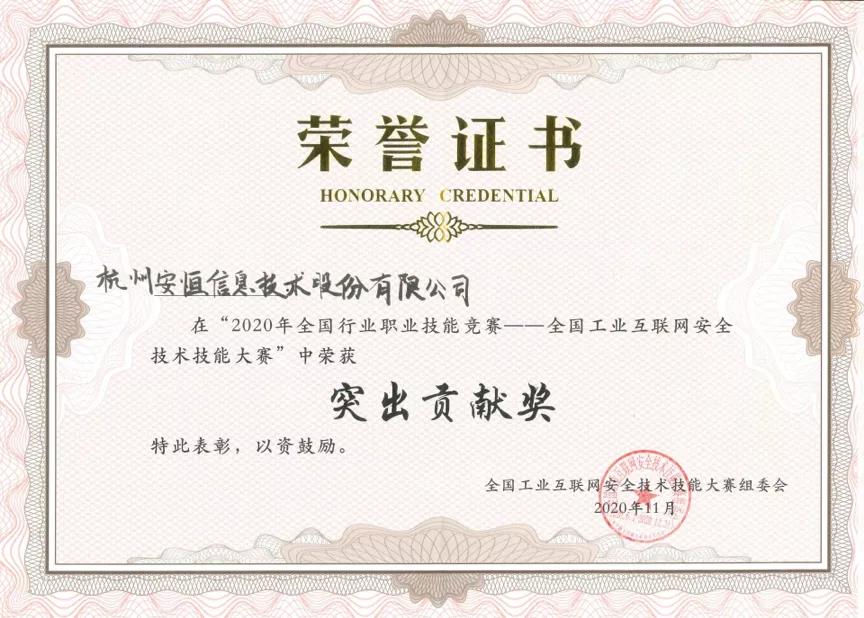 2020年11月6日,获工信部、人社部、全国总工会、共青团中央联合主办的全国工业互联网安全技术技能大赛突出贡献奖;