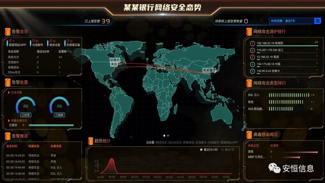 同时安恒信息AiLPHA大数据智能安全平台帮助金融行业构建一套安全运营视角划分清晰、协同响应完善的智能安全运营平台。平台能够通过大屏多维度感知上报事件态势,显示攻击线路与网络攻击、恶意邮件、病毒等及各类事件的处置情况;同时,还能够分析占比高的攻击类型、病毒类型等,实时了解网络安全态势、实现大数据以及SOAR安全运营编排调度能力,通过安全响应流程编排,可实现自动化分析研判、处置联动、通报预警,极大降低安全事件的处置时间,增强运营效率。