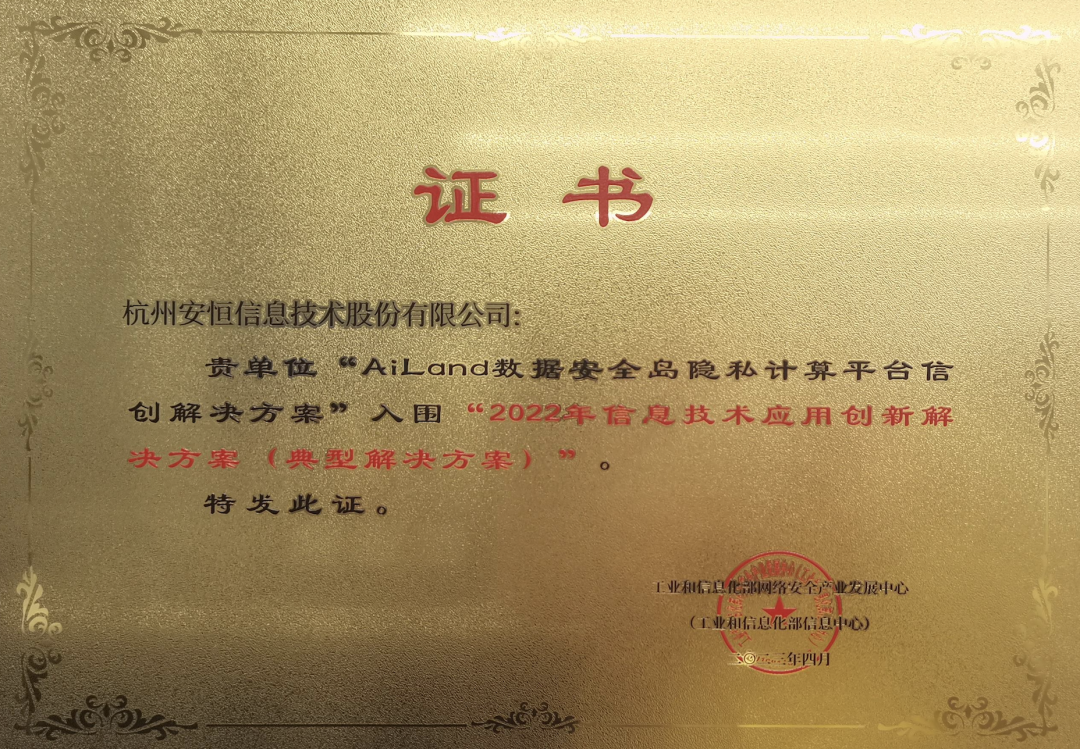 安恒信息隐私计算产品在2023年度获得“2022年信息技术应用创新解决方案” 经工信部权威认证。同时在鲲鹏腾开发者峰会及华为中国合作伙伴大会中精彩亮相。